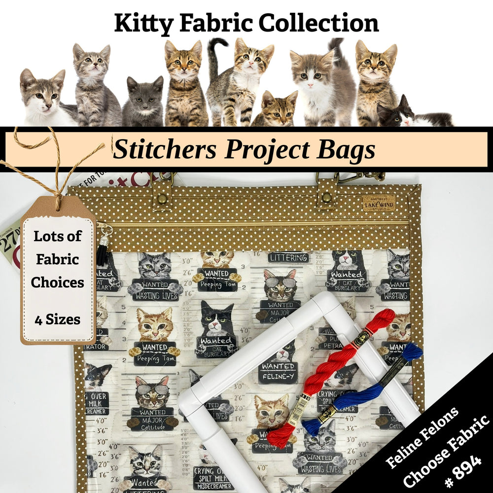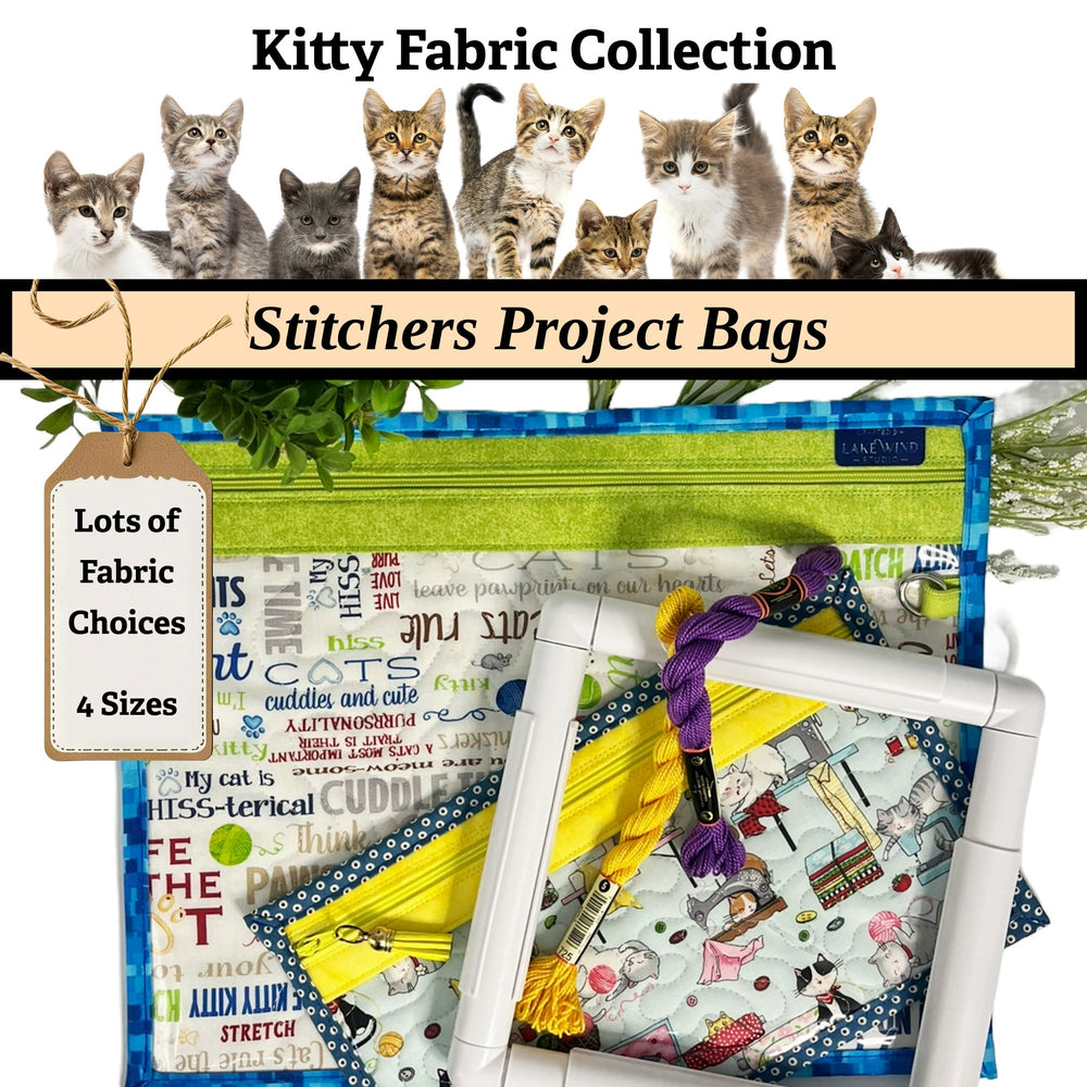 This Kitty collection of vinyl front project bags features feline felons, sewing cats and more. We have lots of Cat theme and ready-made design combinations for you to choose from for your Kitty project bag. Or, if you prefer, make it truly one of a kind and select from the list of other fabrics available in this collection.