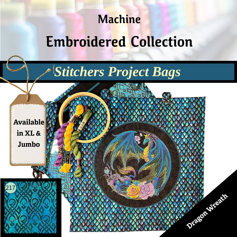 This collection of vinyl front project bags features a back panel with intricate, unique designs completed with machine embroidery. We have dragons, cats, Santa and more designs being added often.