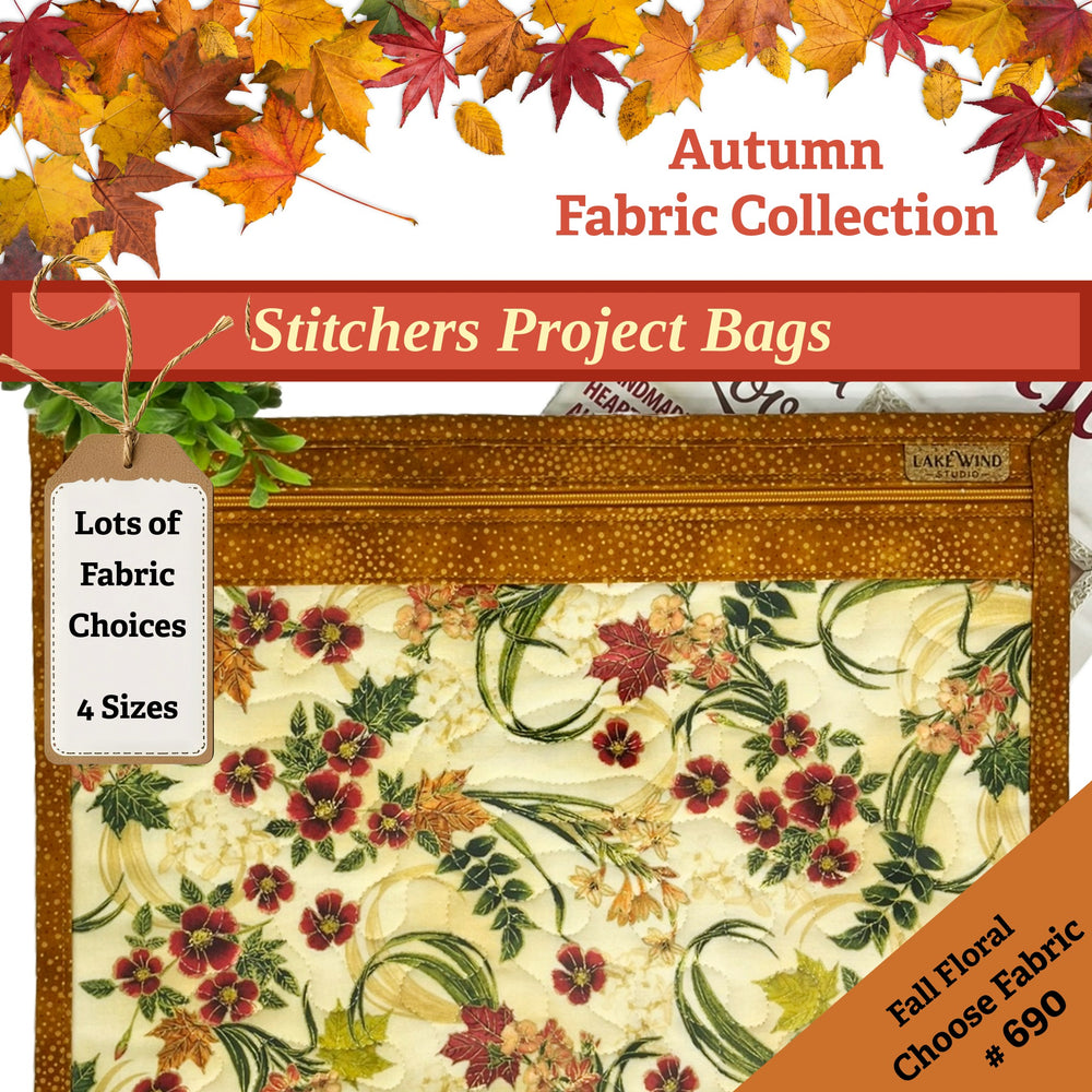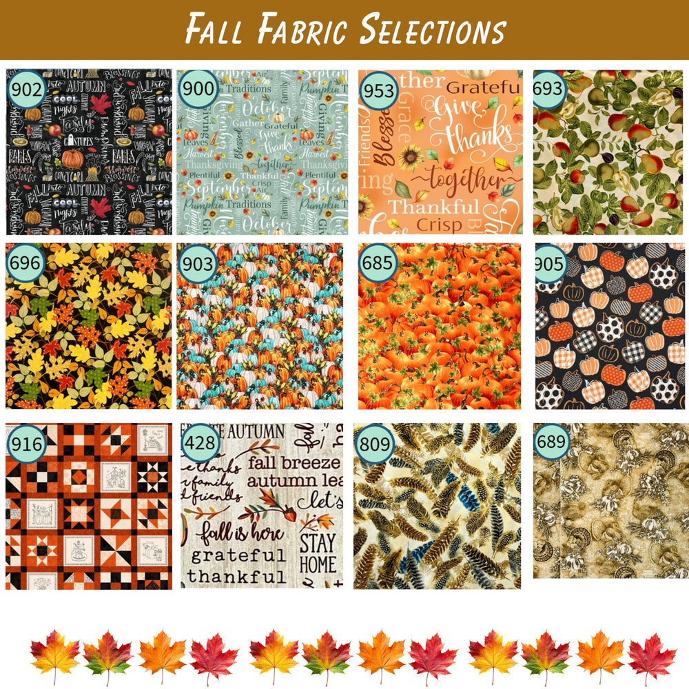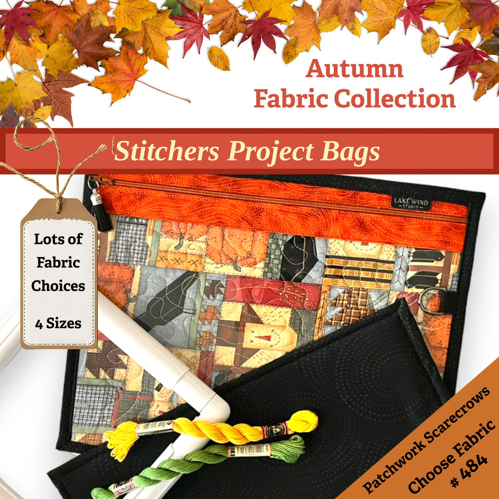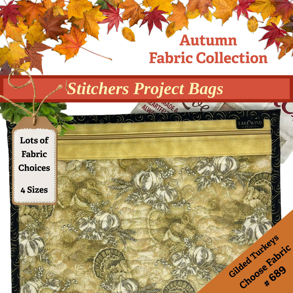This Fall and Autumn collection of vinyl front project bags features gilded pumpkins, turkeys, fall foliage, teal pumpkins, cozy fall word art and more. We have lots of Autumn theme ready-made design combinations for you to choose from for your Cozy Fall stitching project bag. Or, if you prefer, make it truly one of a kind and select from the list of other fabrics available in this collection.