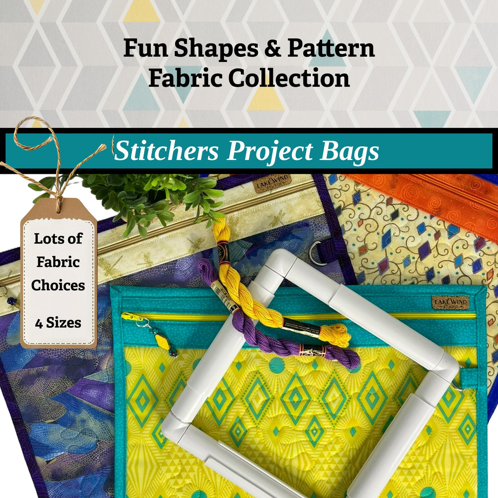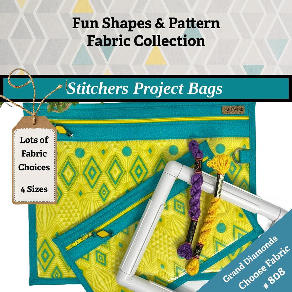 This fun Geometric collection of vinyl front project bags features colorful diamonds, gilded wings, stripes, dots and more. We have several fun and whimsical ready-made design combinations for you to choose from for your Geometric project bag. Or, if you prefer, make it truly one of a kind and select from the list of other fabrics available in this collection.