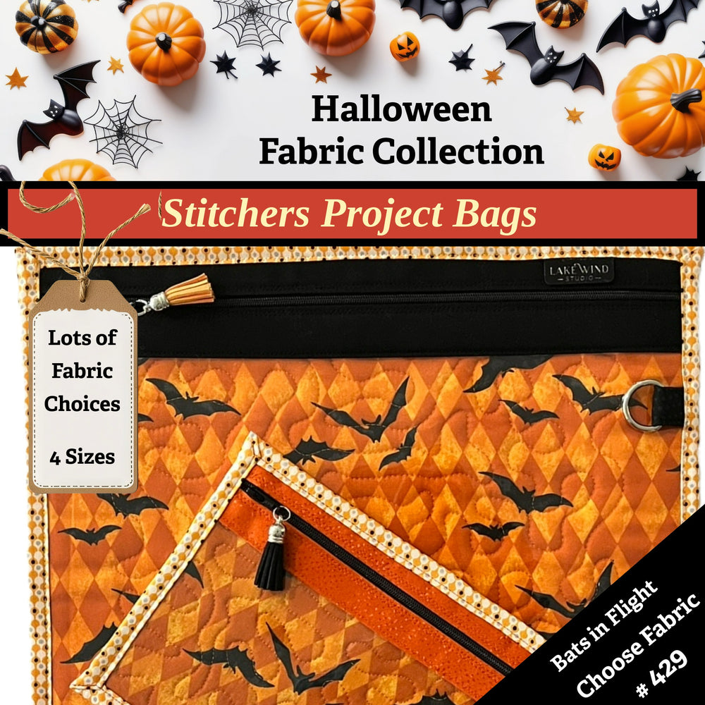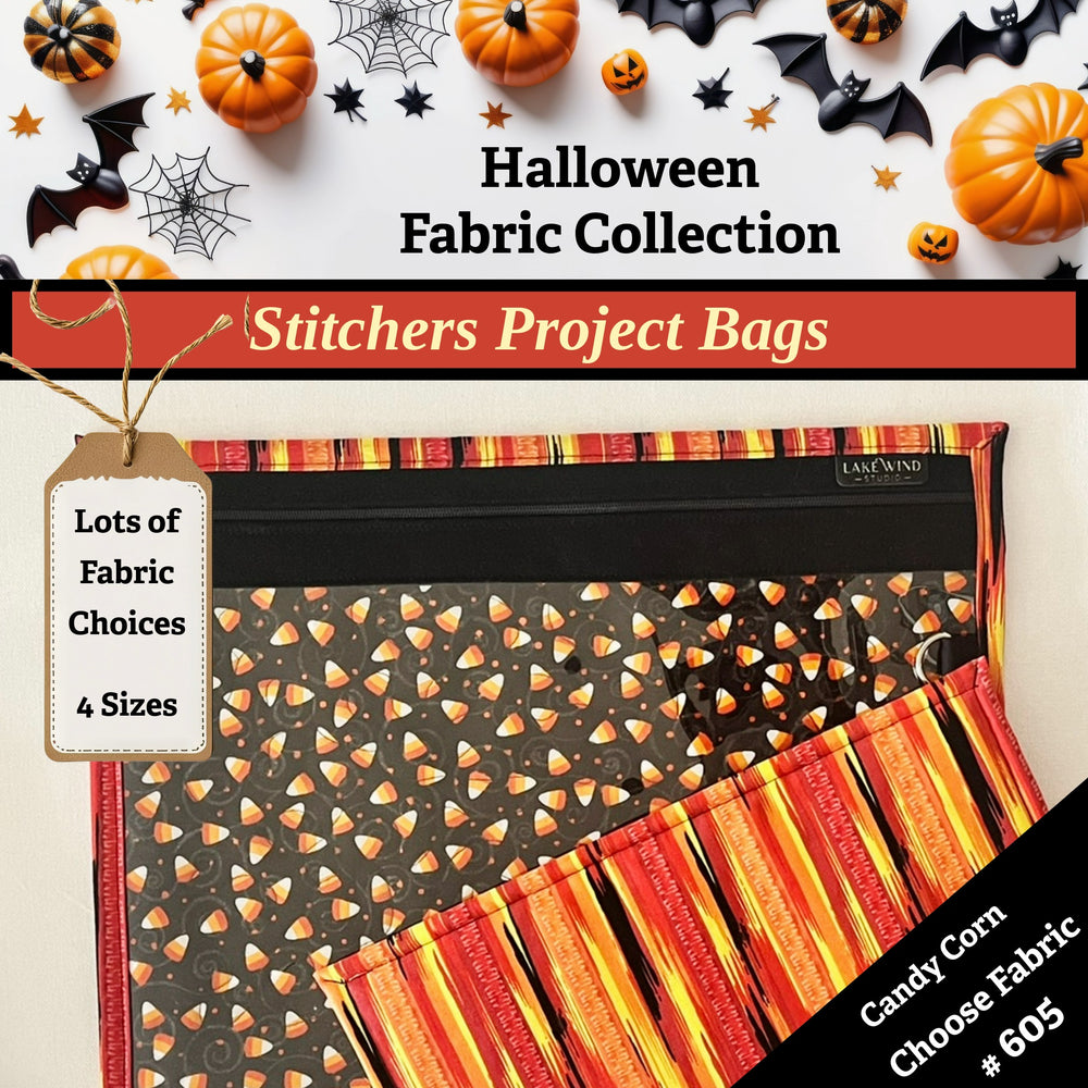 This Halloween collection of vinyl front project bags features bats, spiders, ghosts, pumpkins and more. We have several fun and whimsical ready-made design combinations for you to choose from for your Halloween project bag. Or, if you prefer, make it truly one of a kind and select from the list of other fabrics available in this collection.
