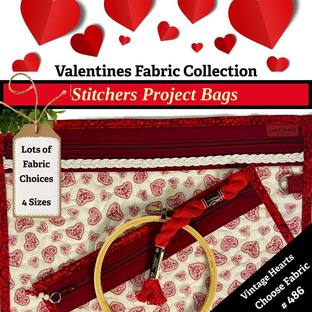 This Valentine collection of vinyl front project bags features hearts of all kind and color including pinks, reds, vintage, gilded, graffiti and more. We have several ready-made design combinations for you to choose from for your Valentine project bag. Or, if you prefer, make it truly one of a kind and select from the list of other fabrics available in this collection.