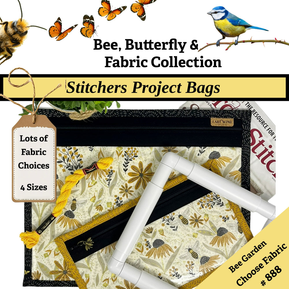 This collection of bird, bee and butterfly vinyl front project bags features bird houses, queen bees, elegant dragonflies, butterflies and more. Browse our ready-made design combinations for you to choose from for your new project bag. Or, if you prefer, make it truly one of a kind and select from the list of other fabrics available in this collection.