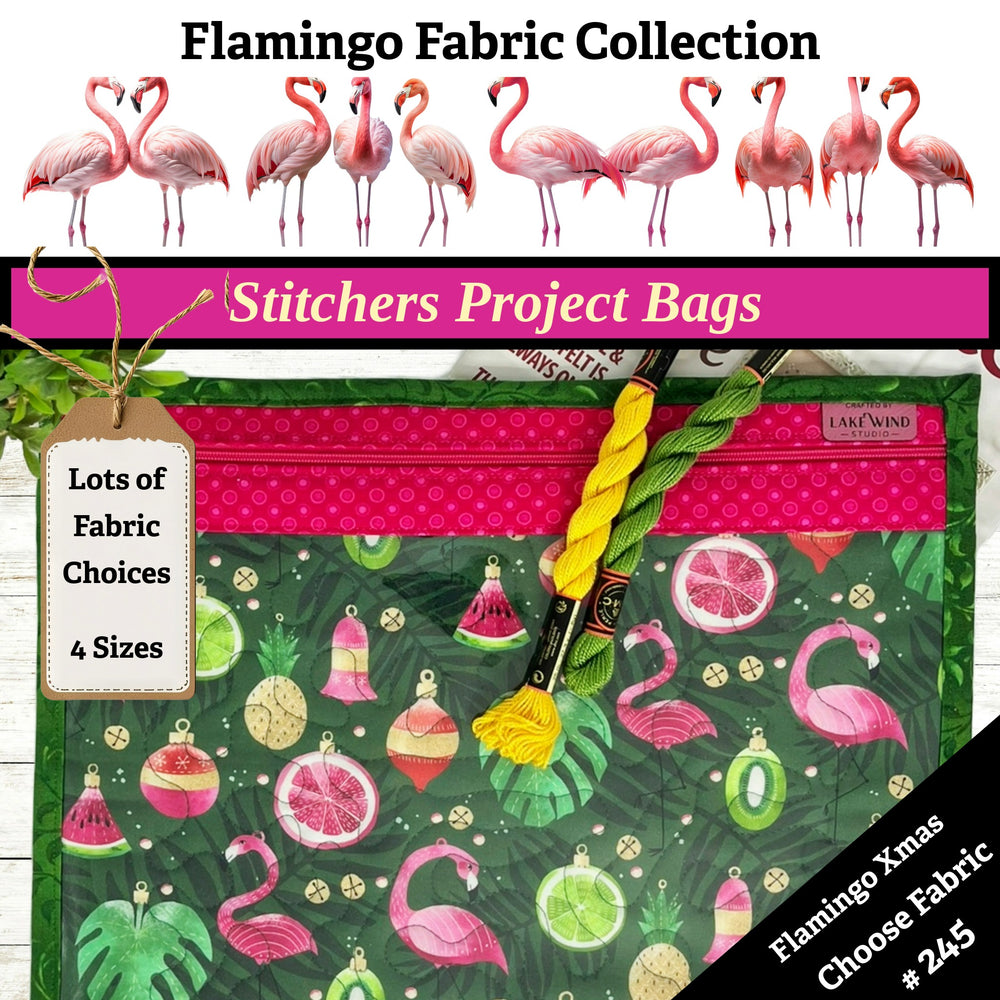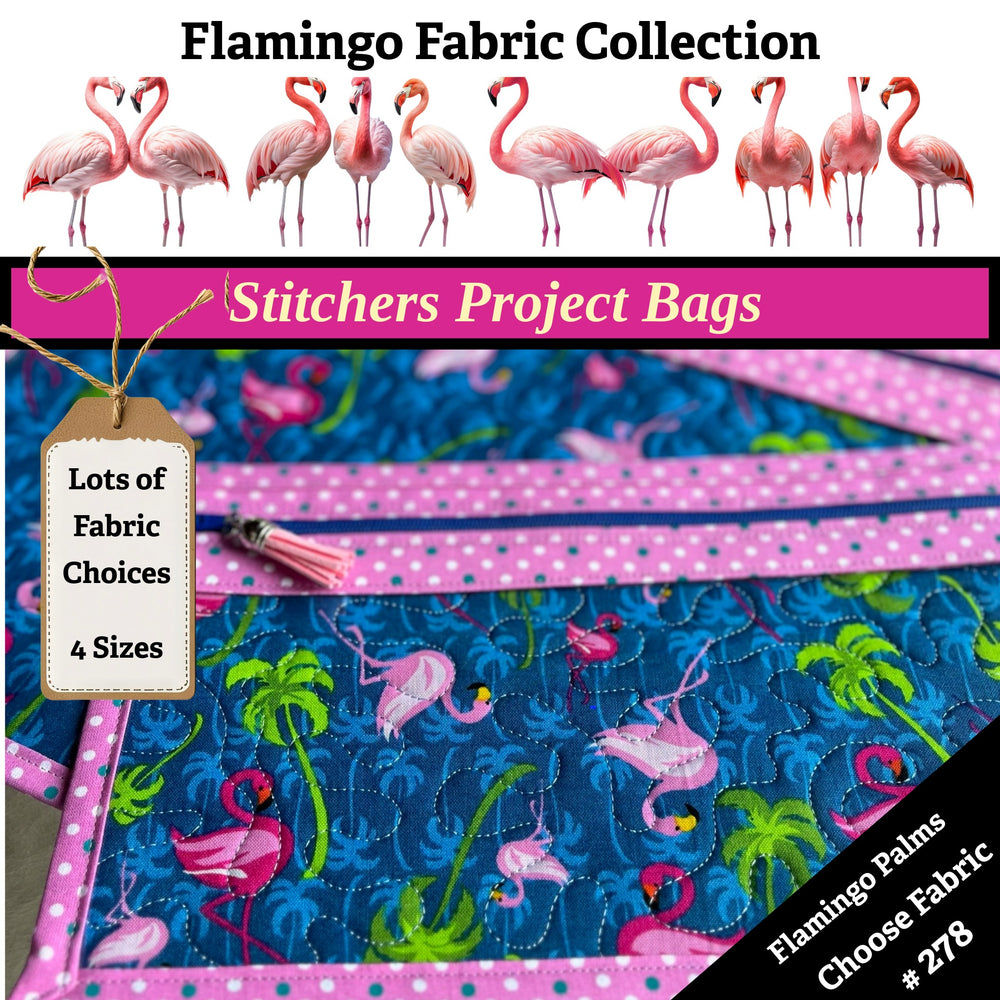 This Flamingo collection of vinyl front project bags features rows of marching flamingos, beach flamingos, palm flamingos and more. We have these fun and graceful birds in several ready-made design combinations for you to choose from for your Flamingo theme project bag. Or, if you prefer, make it truly one of a kind and select from the list of other fabrics available in this collection.